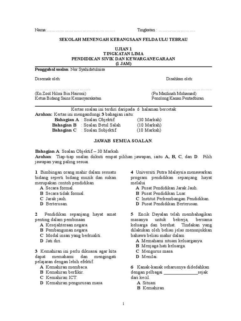 Kertas soalan ini mengandungi dua bahagian iaitu Bahagian A dan. ContentsTAHAP PENDIDIKANJENIS BAHANNAMA BAHANSUMBERMUAT TURUN CETAK Alhamdulillah. PENDIDIKAN SIVIK TINGKATAN 5 UNIT 1 DRAFT.